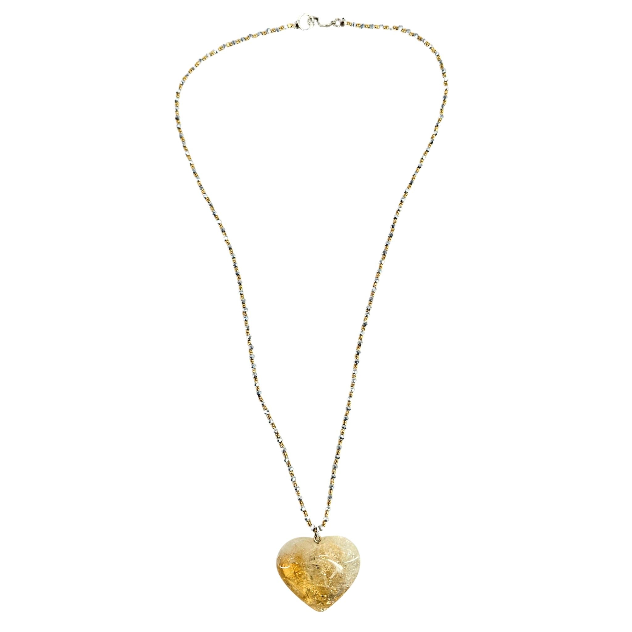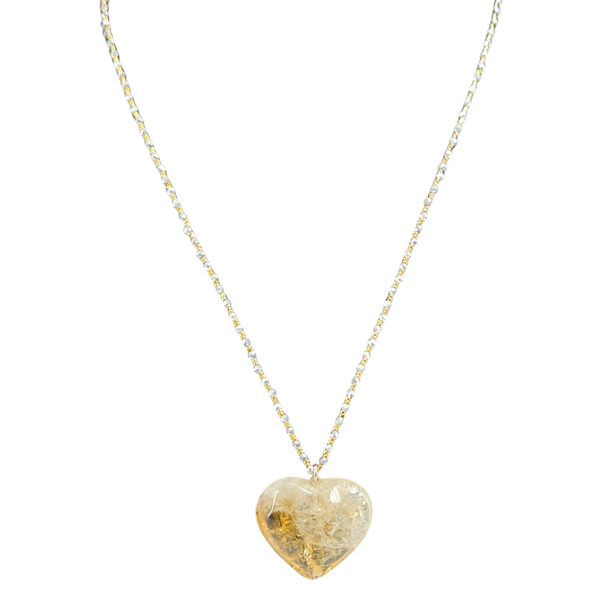 The pendant is elegantly suspended from a delicate strand of faceted micro-beads in alternating silver and gold tones. This shimmering chain provides a modern, sophisticated contrast to the organic, romantic feel of the heart-shaped stone, making it a standout addition to any jewelry collection.