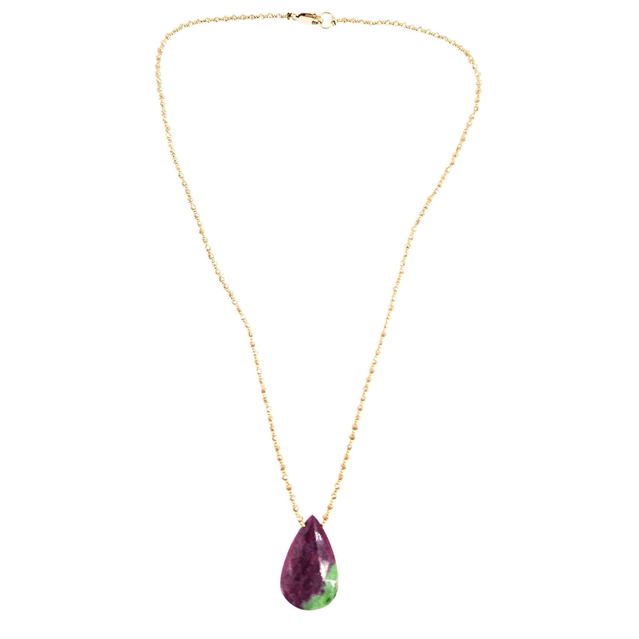 Make a bold statement with the striking contrast of our Ruby in Zoisite Teardrop Necklace. This captivating piece features a high-quality natural gemstone pendant, showcasing a vivid marriage of deep magenta-purple and lush forest green. Suspended from a delicate, shimmering chain, this necklace is designed for the woman who loves her jewelry to tell a colorful story.