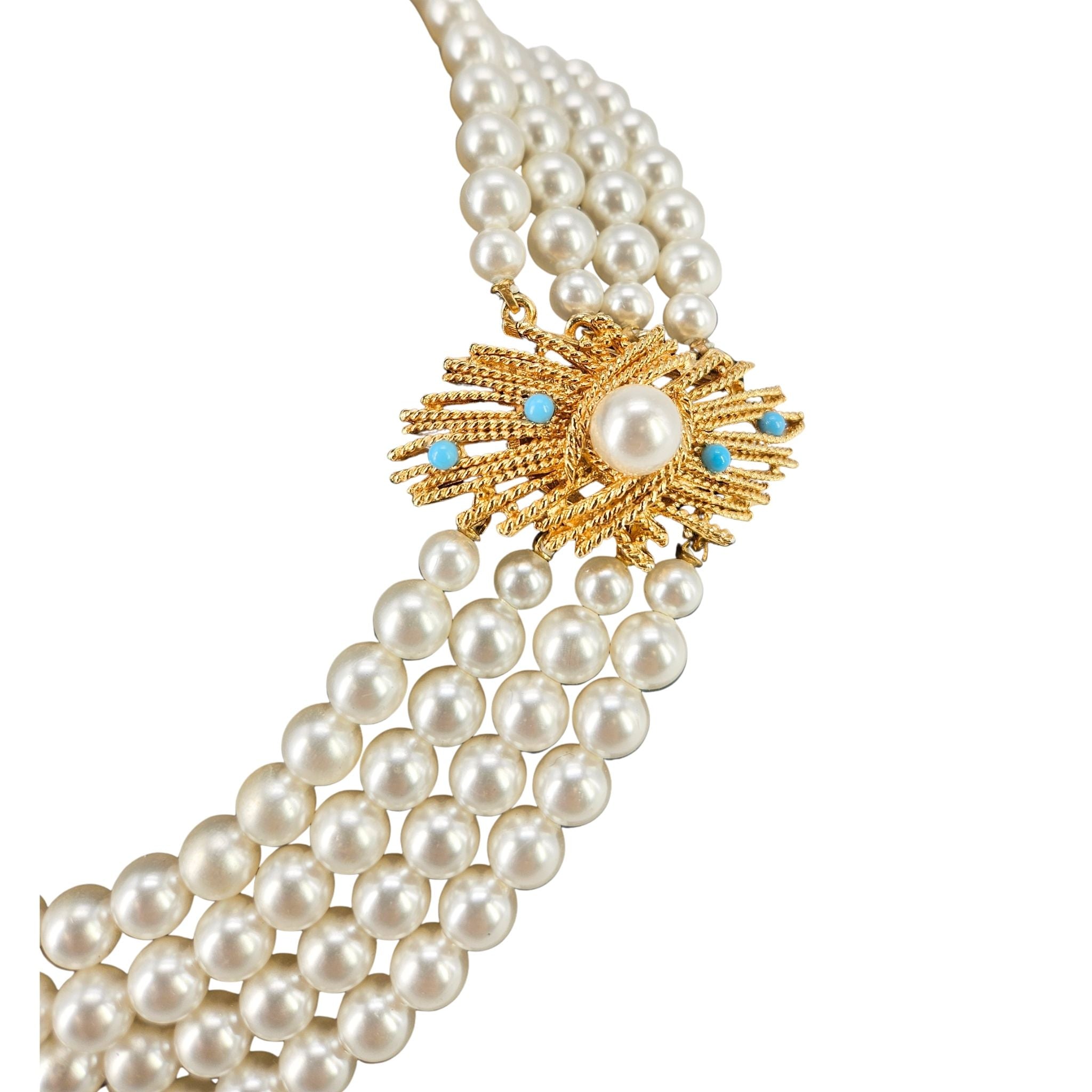 The centerpiece of this necklace is a magnificent gold-toned starburst clasp. This ornate closure is not just functional but a work of art, featuring a central faux pearl focal point accented by vibrant faux turquoise cabochons. Designed to be worn slightly to the side to showcase the clasp, it offers a dramatic and regal silhouette.
