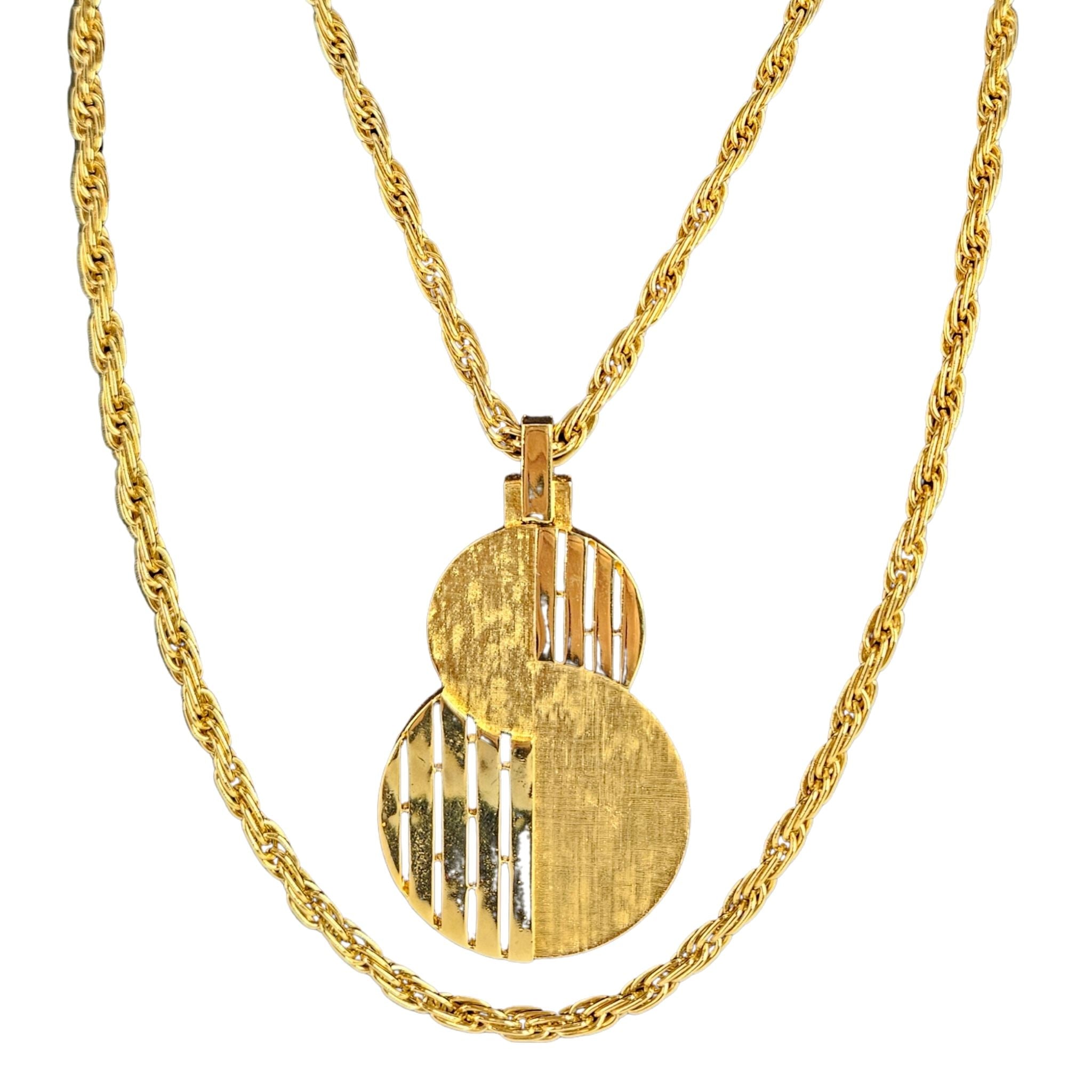 - Design: Large modernist geometric "S" or figure-eight intertwining pendant.