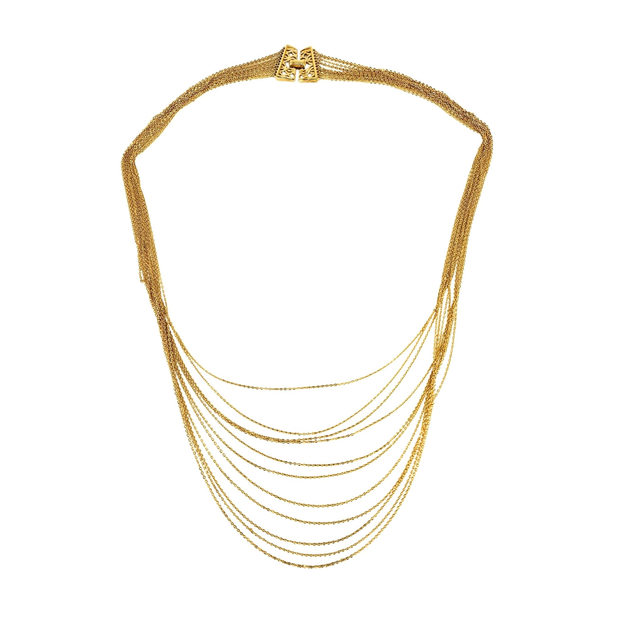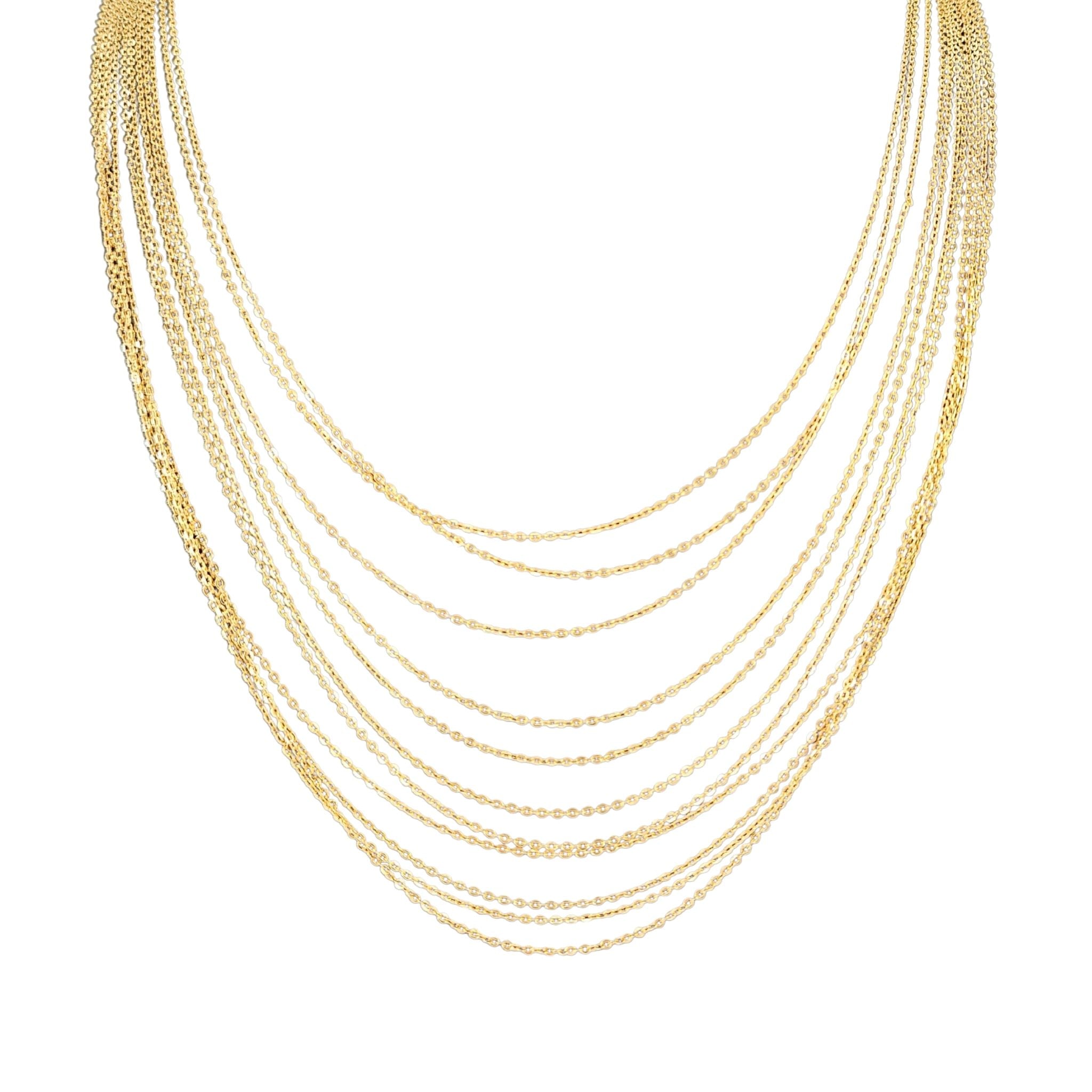 A breathtaking study in light and motion, this statement piece features eleven individual, expertly draped strands of radiant gold-tone chain. Each strand measures a dramatic 32 inches in length, creating a shimmering "liquid gold" effect that cascades beautifully across the décolletage.