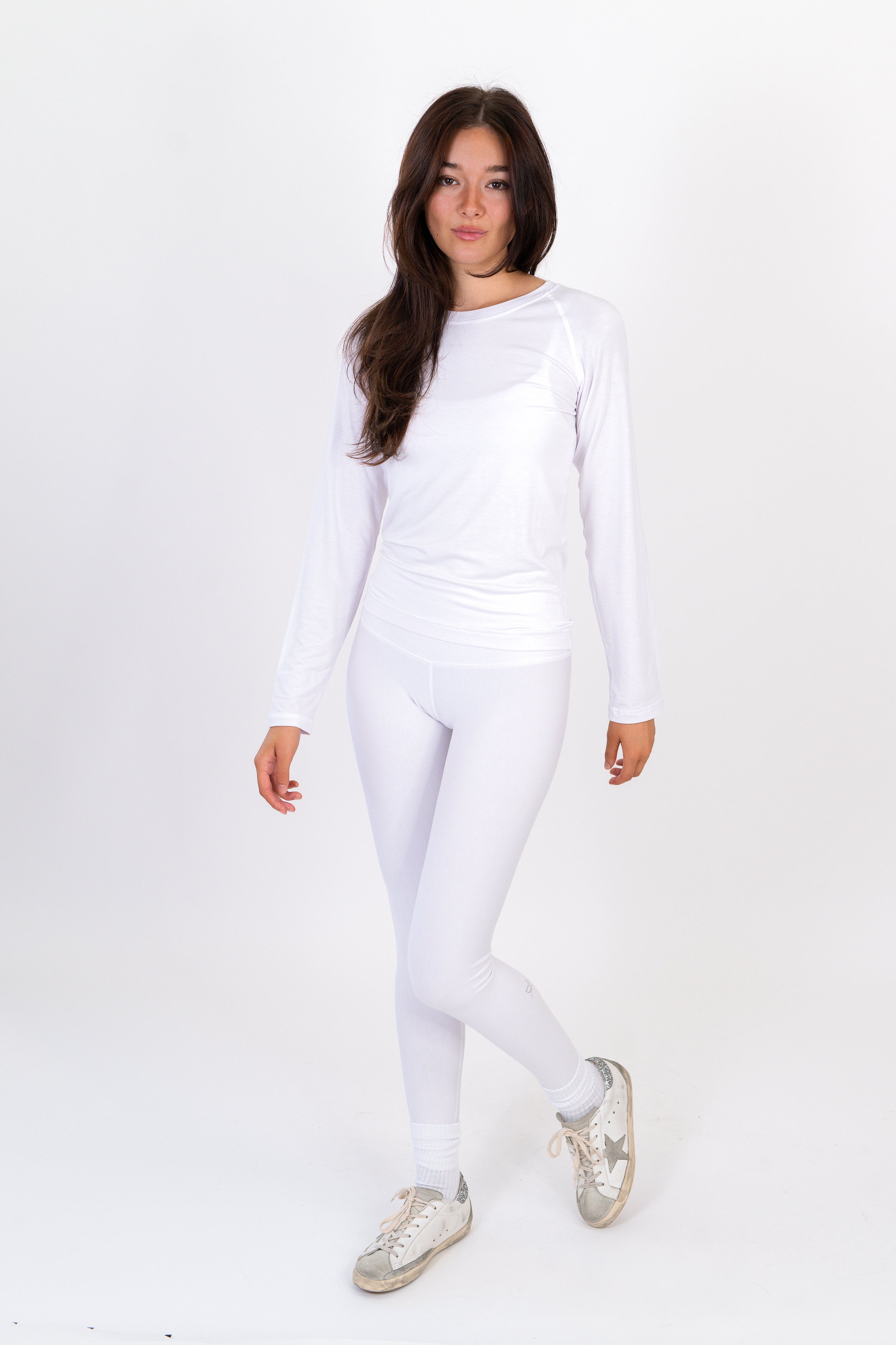 • Model wearing The Everyday Long Sleeve in Fog by ON/OFF Essentials, made from 95% bamboo.