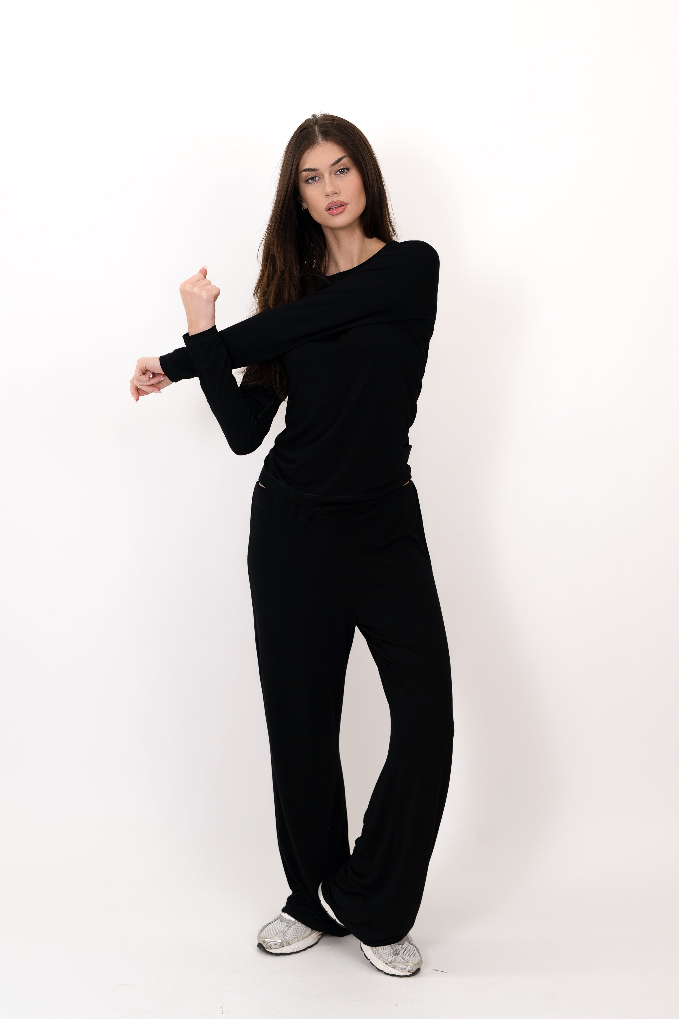 • Model wearing The Everyday Long Sleeve in Onyx by ON/OFF Essentials, made from 95% bamboo.