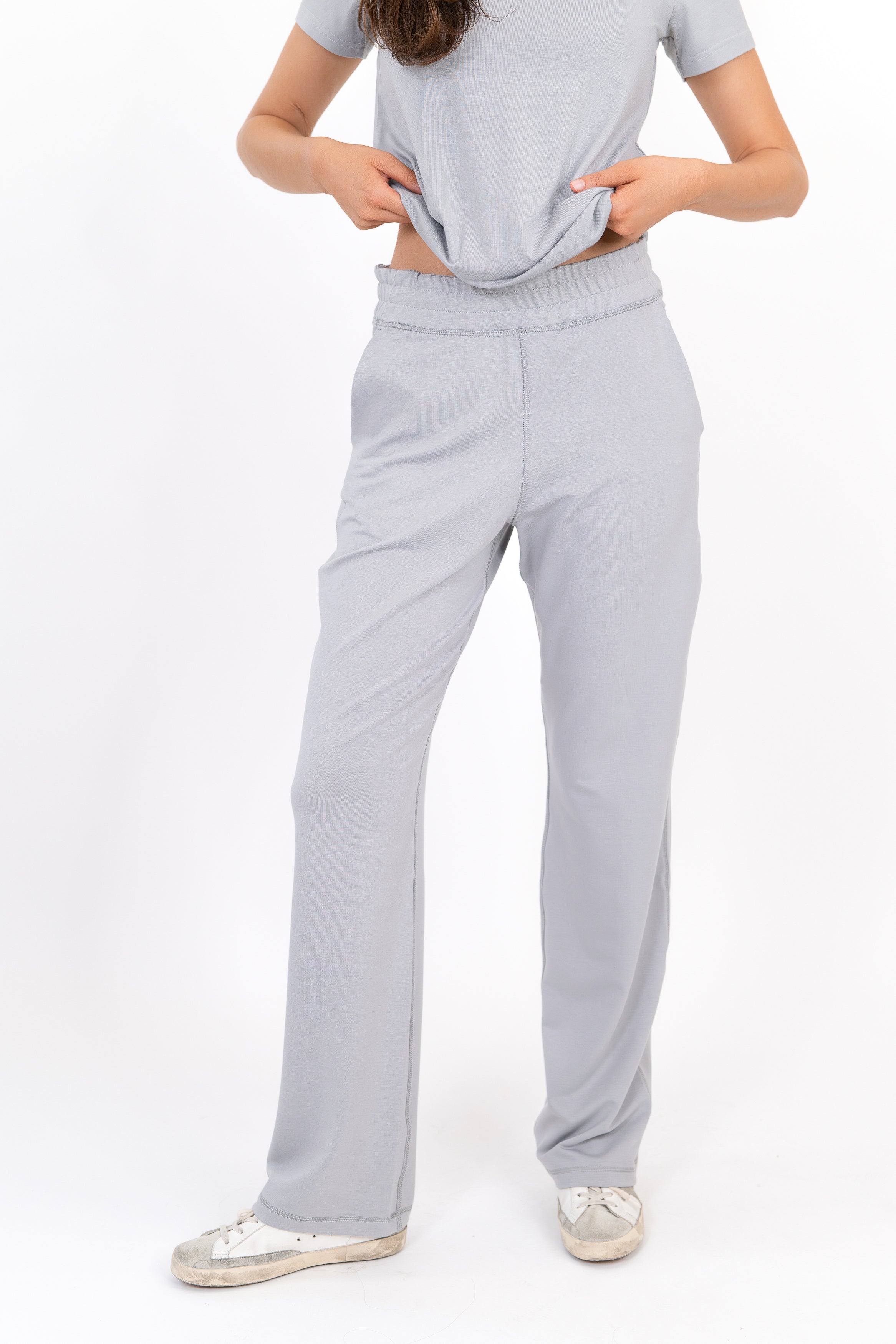 • Model wearing The Solace Wide Leg Sweatpant in Fog by ON/OFF Essentials, made from 95% bamboo fleece.