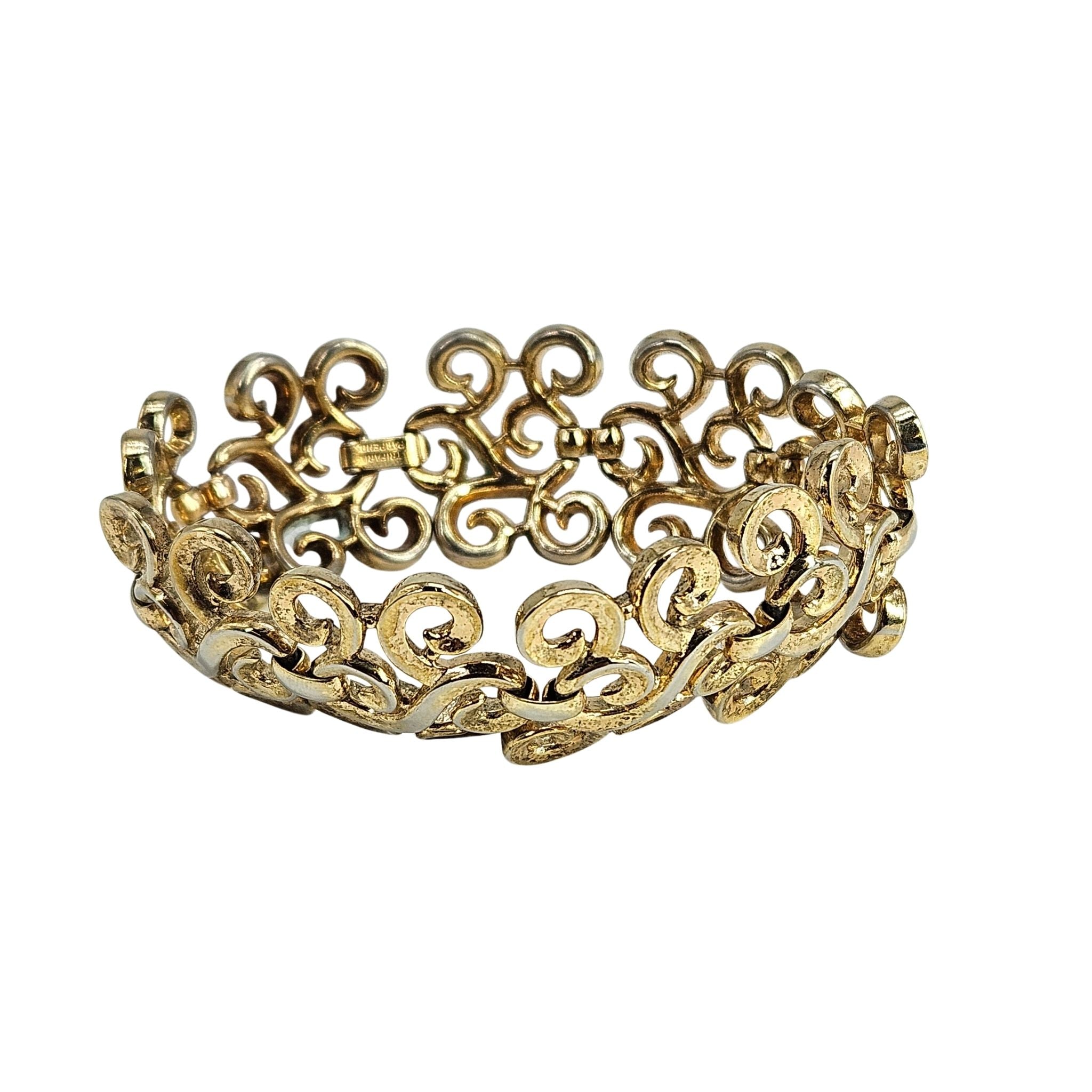 Step back into the golden age of glamour with this striking 1950s swirl cuff bracelet. Perfectly capturing the bold, architectural aesthetic of the mid-century era, this piece features a fluid, rhythmic design that mimics the look of high-end fine jewelry. Whether you are dressing up a casual look or adding a finishing touch to a cocktail ensemble, this bracelet brings a sophisticated vintage vibe and a touch of Old Hollywood elegance to your collection.